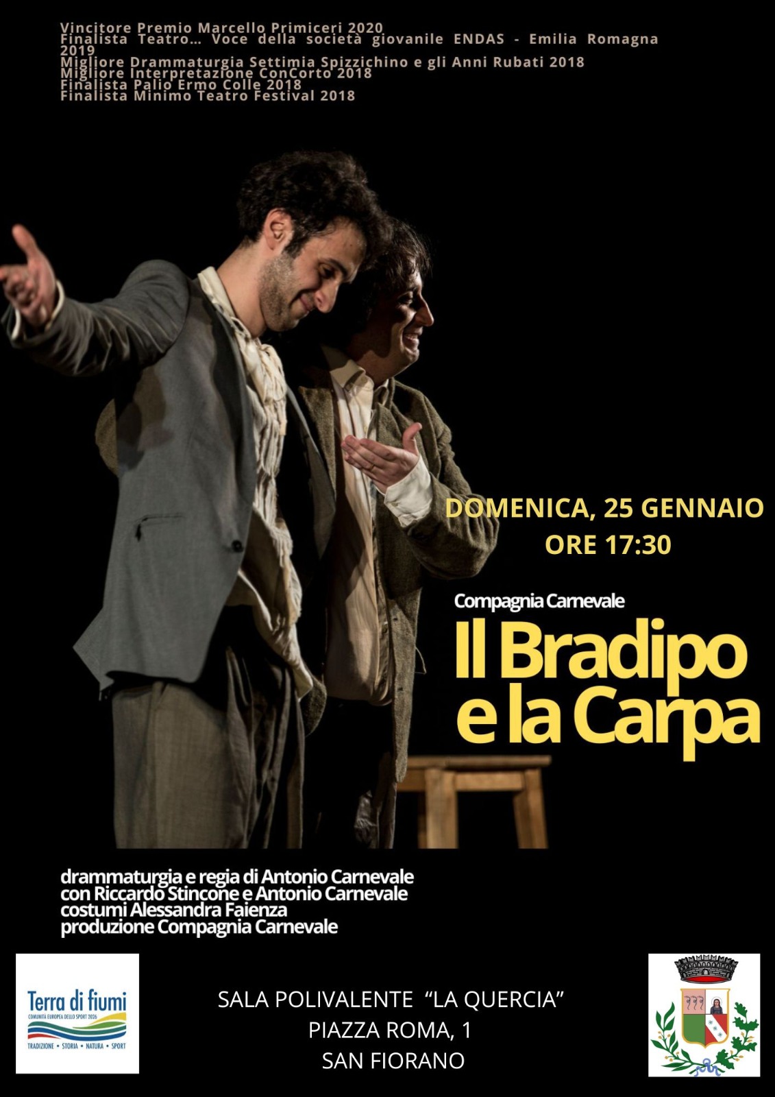 “Il Bradipo e la Carpa”, adattamento per la scena del volume di Roberto Quartarone “Due Eroi in Panchina” – è il racconto dell’amicizia tra i due allenatori ungheresi Istvan Tóth e Géza Kertész. Sullo sfondo i campi di calcio italiani degli anni ’30 – che i due hanno rivoluzionato con le loro idee -e la città di Budapest, coinvolta nelle vicende della Seconda Guerra Mondiale. I due amici si raccontano, e raccontano senza risparmiare ironia e sarcasmo, gli avvenimenti più felici della loro vita, in un crescendo che mette insieme il calcio, l’amore, la bellezza delle città italiane (Catania e Trieste in particolare), fino alla tragedia e al delirio degli ultimi anni della seconda guerra mondiale.
